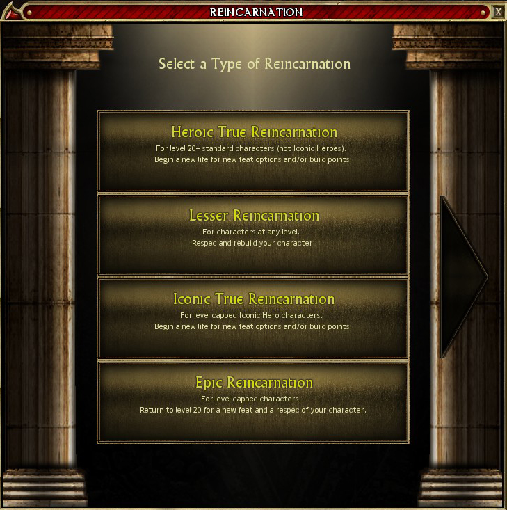 Congratulations! By Reincarnating, you have chosen to purge your weaker form to make room for a new, better you! You’ll be taken to the character creation screen, where you may customize your character by selecting your race, class, abilities, feats, and skills. You will also have the opportunity to change many things about your character, such as their looks, skill point distribution, feat selection, and more.