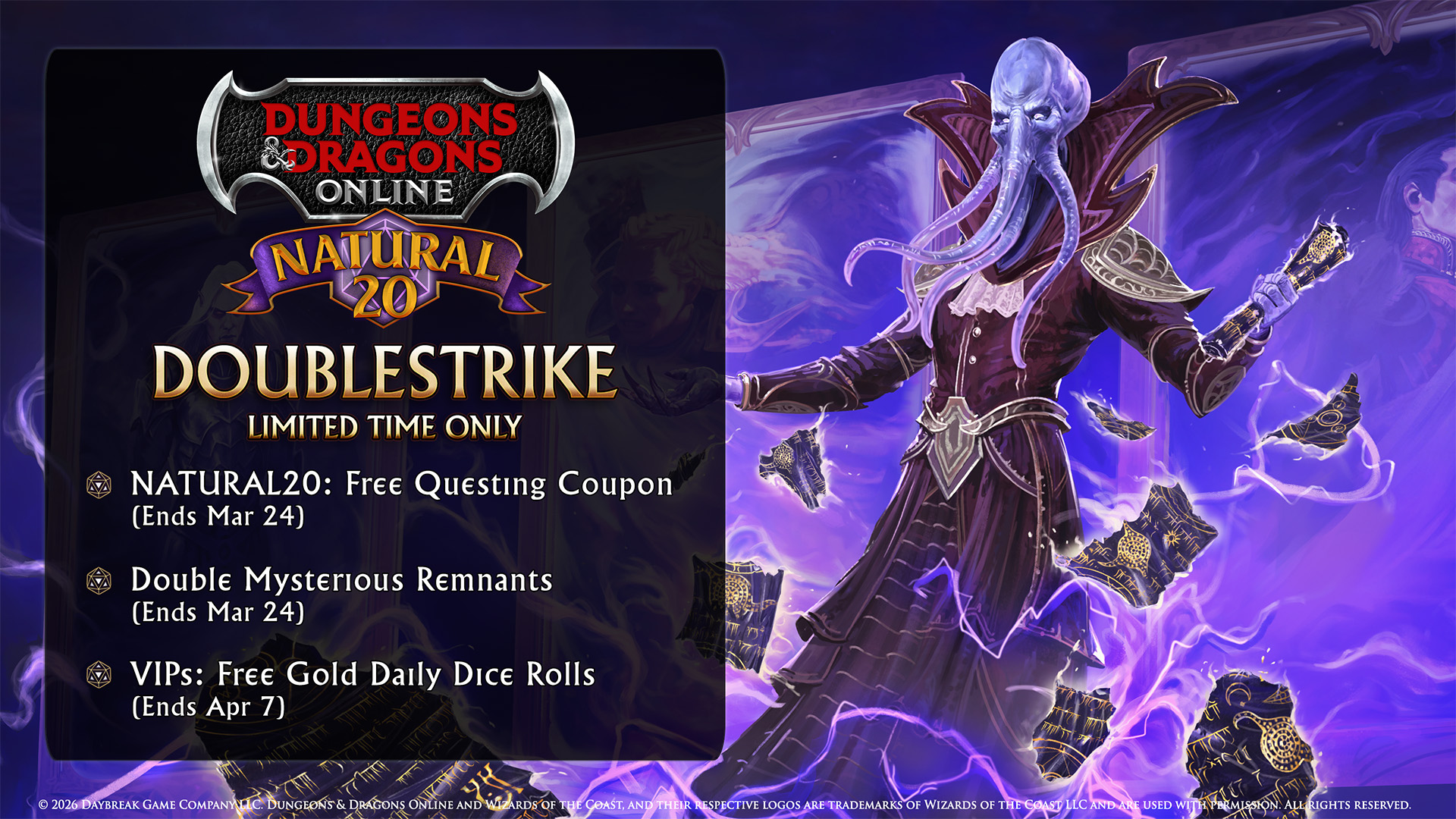 - Gather Your Party: Our free questing coupon has returned through March 24th! Use the code NATURAL20 in the in-game store. See the full list on DDO.com.