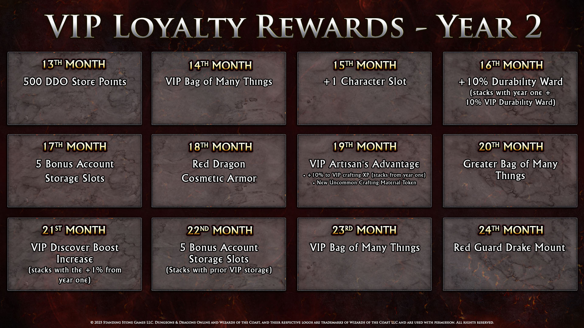 For any questions related to the VIP program and your subscription, please contact Account Support through help.standingstonegames.com.