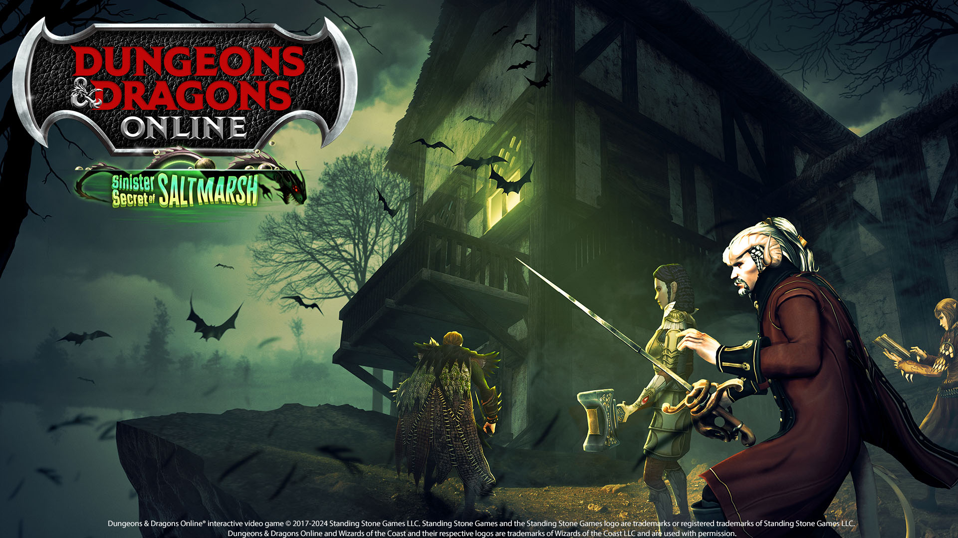 Unravel the mystery and rumors of strange happenings near a remote seacoast town on the edge of civilization in Dungeons & Dragons Online: Sinister Secret of Saltmarsh. Explore the marshlands and fight new enemies, brave a desolate, haunted mansion, and uncover the true secrets of Saltmarsh in this mini-expansion! The Sinister Secret of Saltmarsh quest pack is Heroic Lvl 3 and Legendary Lvl 32 containing 10 Dungeons and a landscape. It can be accessed through an NPC in the Gatekeeper's Grove.